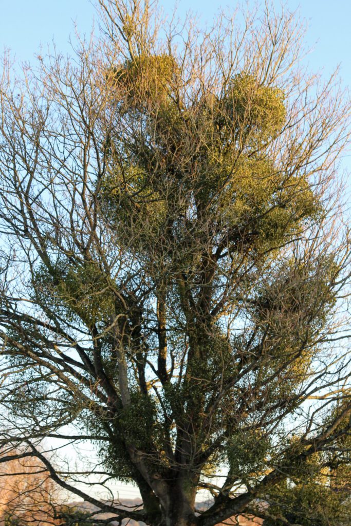 When older trees stand bare against the low sky, mistletoe hangs in their branches like dark thoughts. From the ground it looks an accident: round, self-contained worlds lodged high in the branches like lost balloons. Neither leafless nor quite at home.